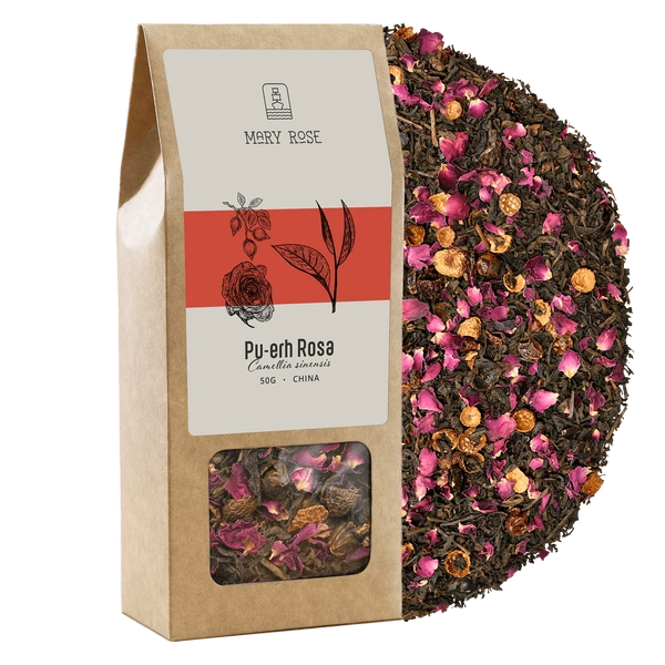 Mary Rose Pu-erh Rosa ist eine sinnliche Verbindung des roten Tees Pu-erh mit Rosenzusätzen - Hagebutte und Rosenblättern. Aus der Verpackung des Tees riecht es nach der ersten Öffnung nach einem subtilen, verführerischen Aroma, das einem Strauß wunderschöner Rosen ähnelt. Das angenehme Aroma ist dauernhaft und man spürt es eine lange Zeit nach dem Aufbrühen des Tees.