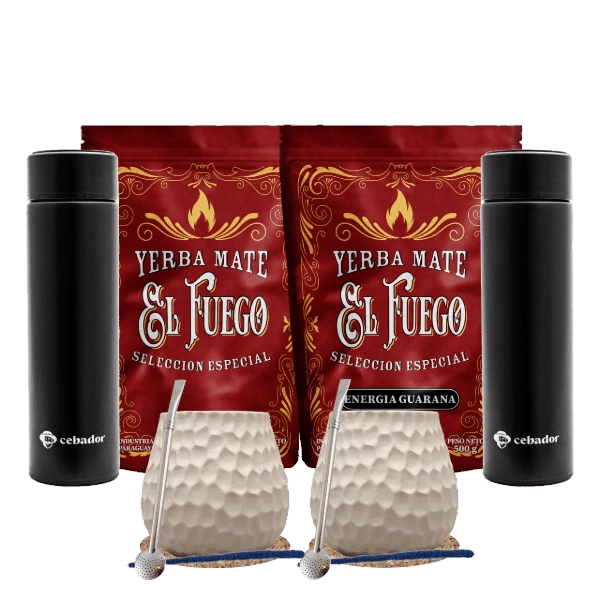 Mate-Tee-Set für zwei: El Fuego 2x500g + 2x Thermosflasche LED + 2x Kalebasse + 2x Bombilla
