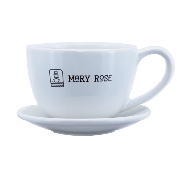 - Weiße Tasse mit Mary-Rose-Logo und Untertasse.