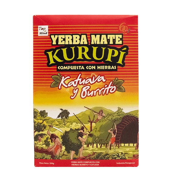 - Kurupi Katuava y Burrito 0,5 kg 500 g ist Mate Tee mit dem Zusatz von Catuaba-Rinde und Burrito-Kraut. Er stammt aus Paraguay. Sein Kräuteraroma gleicht die Bitterkeit perfekt aus.