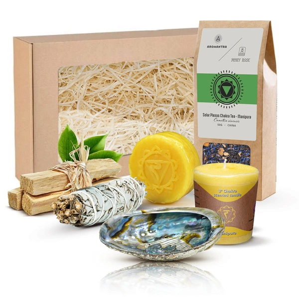 Geschenkset für Solarplexuschakra (Manipura): Chakra-Tee + Räucherstäbchen + Kerze
