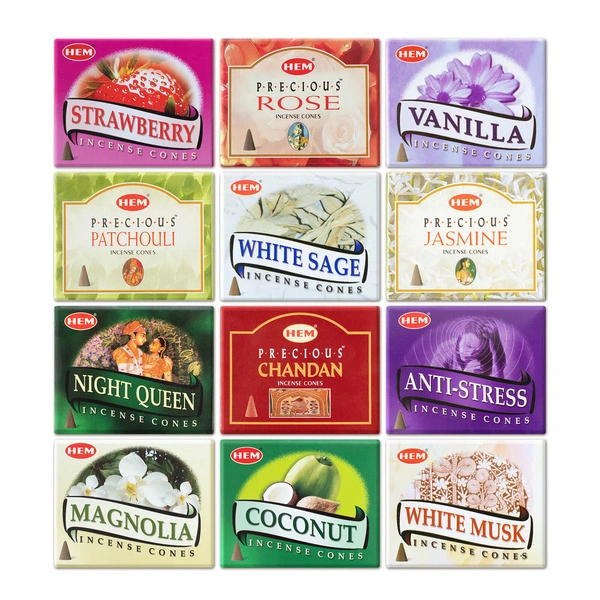 - Ein Set von HEM-Räucherkegeln in 12 aromatischen Varianten. Perfekt zur Entspannung, Energiereinigung und Schaffung einer einzigartigen Atmosphäre. Ideal für Abendtee, Mate Tee oder Meditation.