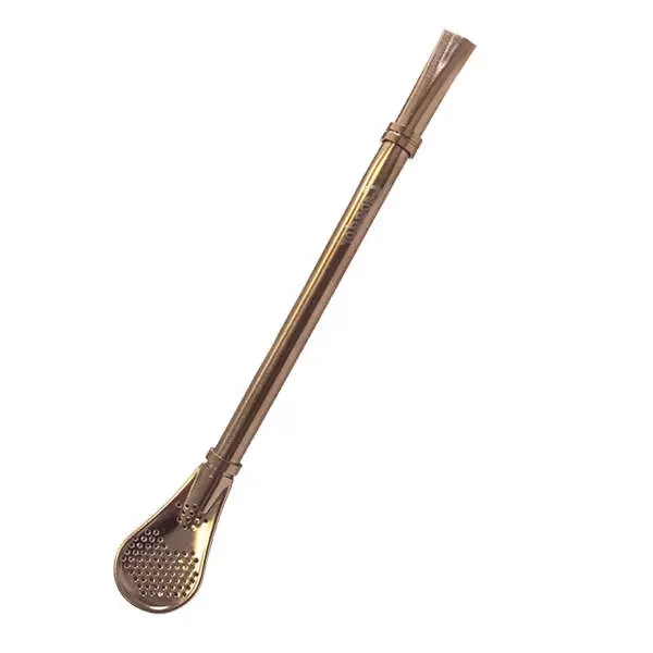 Sehr sorgfältig hergestellte Bombilla aus Edelstahl, leicht gekrümmt. Es hat ein Filterelement in Form eines Siebs. Diese einfache Konstruktion ermöglicht eine gute Filtration und ein reibungsloses Trinken. Kupferfarbe.
