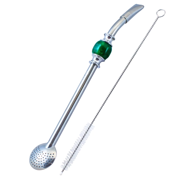 Große Bombilla für Mate Tee, neben dem Mundstück befindet sich ein farbiger Kühlring. Edelstahl sorgt für Haltbarkeit und Beständigkeit gegen mechanische Beschädigungen und hohe Temperaturen. Einfaches Design verleiht Eleganz und Funktionalität.