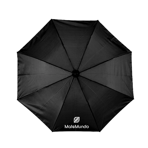 - Zusammenklappbarer schwarzer Regenschirm mit dem Logo des MateMundo-Shops.
