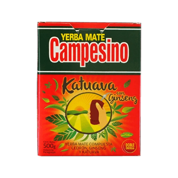 - Campesino Katuava ist Mate Tee aus Paraguay mit der Rinde des Strauches catuaba (Erythroxilum catuaba), Ginseng (Panax ginseng) und Zitronenstrauch (Aloysia triphylla). Eine perfekte natürliche Alternative für diese, die eine Anregung suchen.